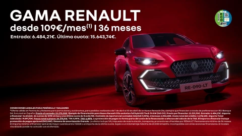 (1)Oferta válida en Península y Baleares para particulares y autónomos, para pedidos realizados del 1 de abril al 30 de abril de un Nuevo Renault Clio, siempre que financien a través de preference con RCI Banque SA, Sucursal en España. Precio al contado: 23.270,00€. Ejemplo de financiación para Nuevo Renault Clio evolution full hybrid E-Tech 116 kW (160 CV). Precio por financiar: 22.531,53€. Entrada: 6.484,21€. Importe a financiar: 16.613,16€. 36 cuotas de 109€ al mes y una última cuota de 15.643,74€. Comisión de Apertura (al contado): 323,96€ (1,95%). Intereses: 2.954,58€. Coste total del crédito: 3.278,54€. Importe Total Adeudado: 19.891,70€. Precio total a plazos: 26.375,91€. TIN: 5,95%. TAE: 6,88%. La protección de pagos no forma parte del coste de la financiación a efectos del cálculo de la TAE. El importe a financiar incluye protección de pagos opcional (565,84€). Sistema de amortización francés. La oferta incluye IVA, impuesto de matriculación, transporte, promociones ofrecidas por RENAULT. Permanencia mínima de 36 meses. El importe mínimo a financiar será el de mayor cuantía entre 7.000€ o el importe de la última cuota. Sujeto a un kilometraje máximo de 20.000 kms/año. Incompatible con otras acciones financieras. El modelo visualizado puede no coincidir con el ofertado.